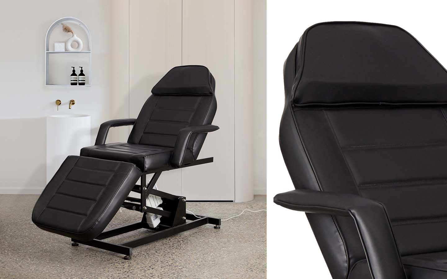 The quiet motor effortlessly raises and lowers the table. The solid steel frame ensures stability with the added bonus of a manual back and leg adjustment, which can be easily converted into a chair position. With the option of removable flexible armrests, this beauty bed offers incomparable quality and value for beauty treatments.