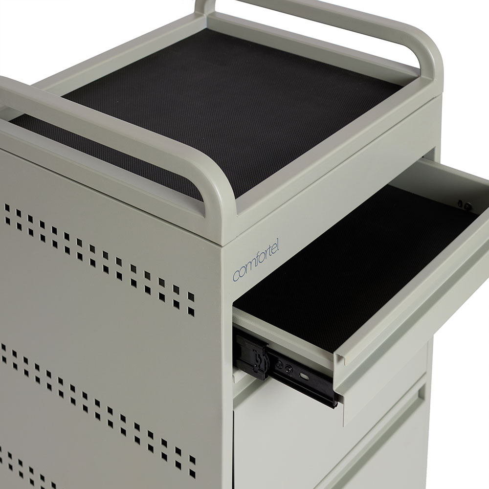 For the lovers of minimal and sleek clean lines. Designed by the team at Comfortel, this hairdressing trolley in a matte mist green metal finish features 3 spacious drawers as well as an extra slide out draw for workspace. This full metal powder coated salon trolley comes with handles, a roomy top tray, removable heat proof mat as well as Comfortel’s signature hair repellent wheels. An extra bonus: the matte mist green metal is stain resistant*. This means hair dye can be wiped away using everyday household cleaner.