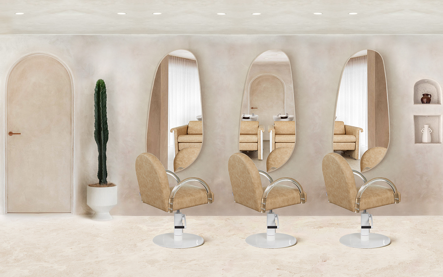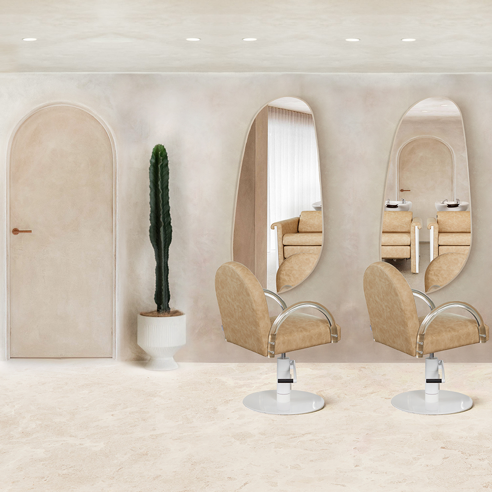 Archie is a salon chair unlike any other. With its bold curves and unique design, it’s sure to make a statement in any salon. The textured sand upholstery adds a touch of sophistication, while the clear acrylic arms and linear backrest and seat create a striking contrast. This chair is an exploration of form and light, adding a sense of weightlessness and transparency to your salon interior.