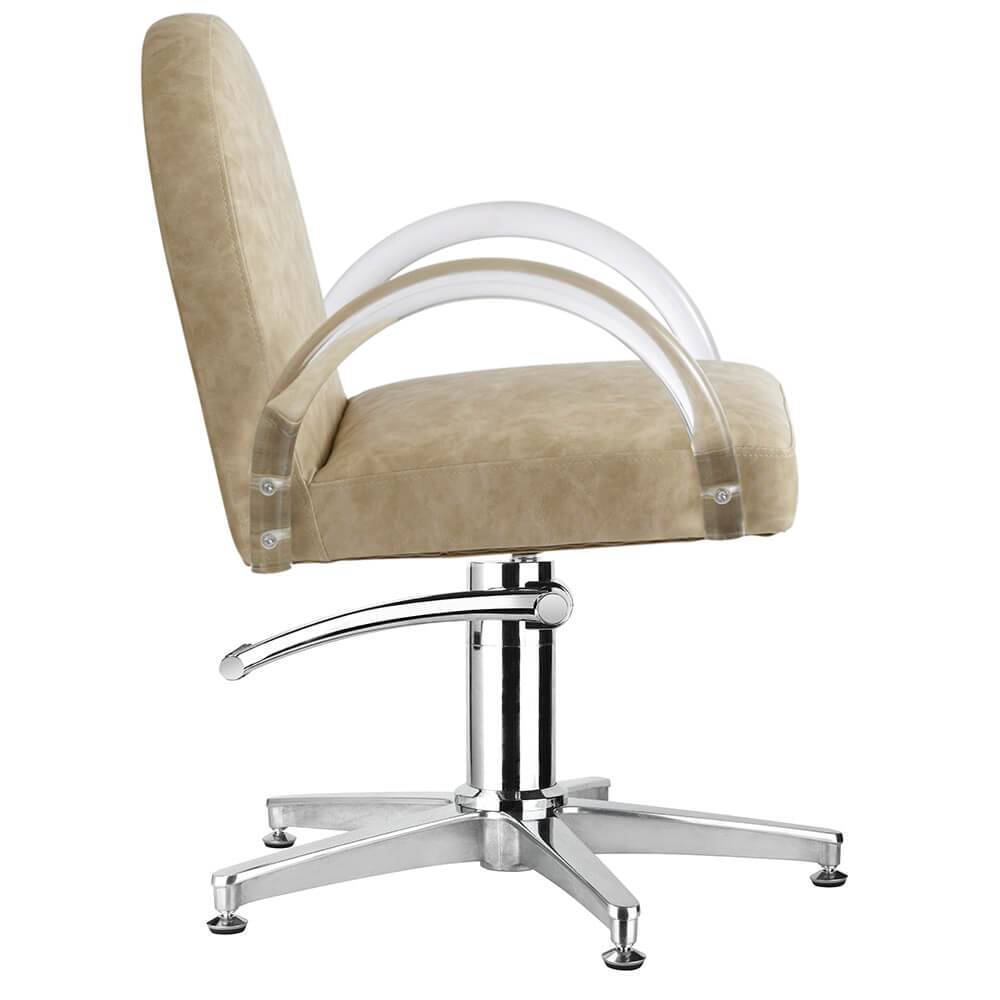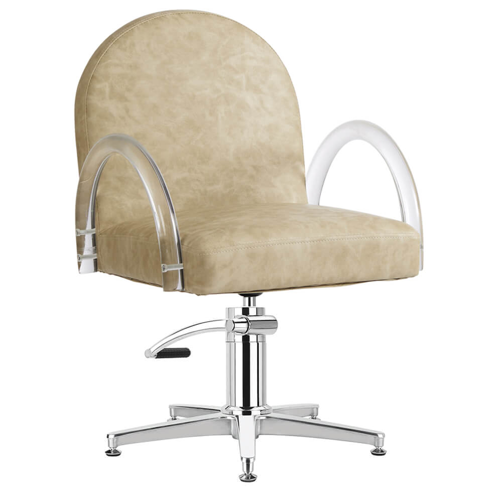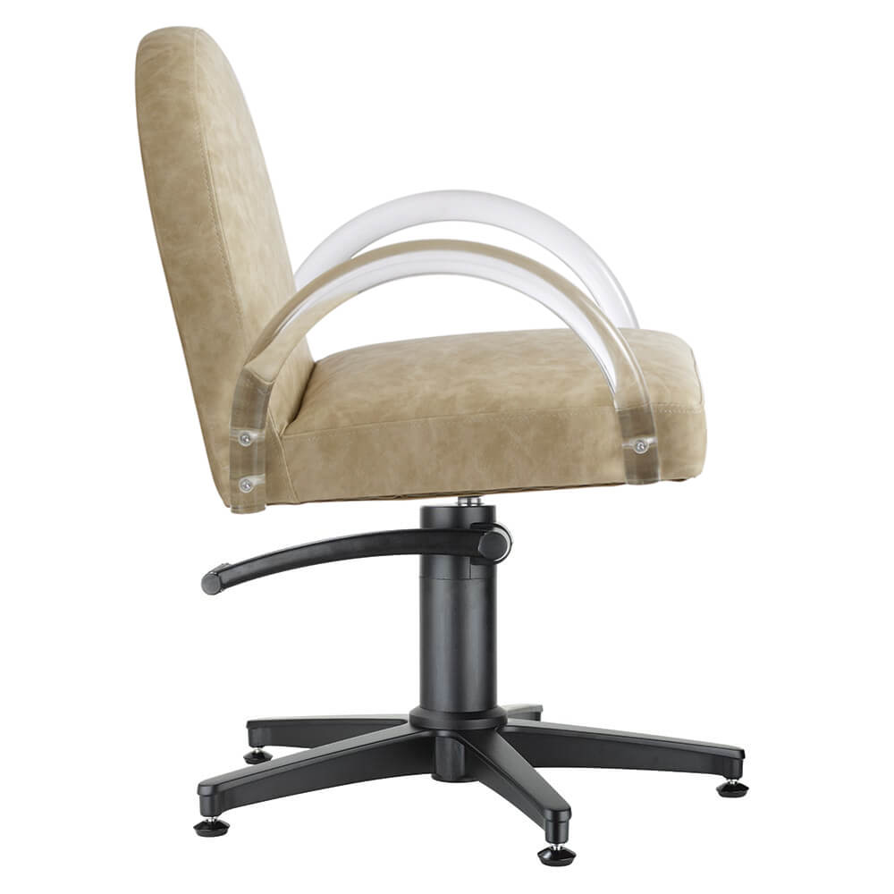 Introducing Archie, a curvaceous salon chair with accent acrylic arms for those seeking a neutral yet bold design.