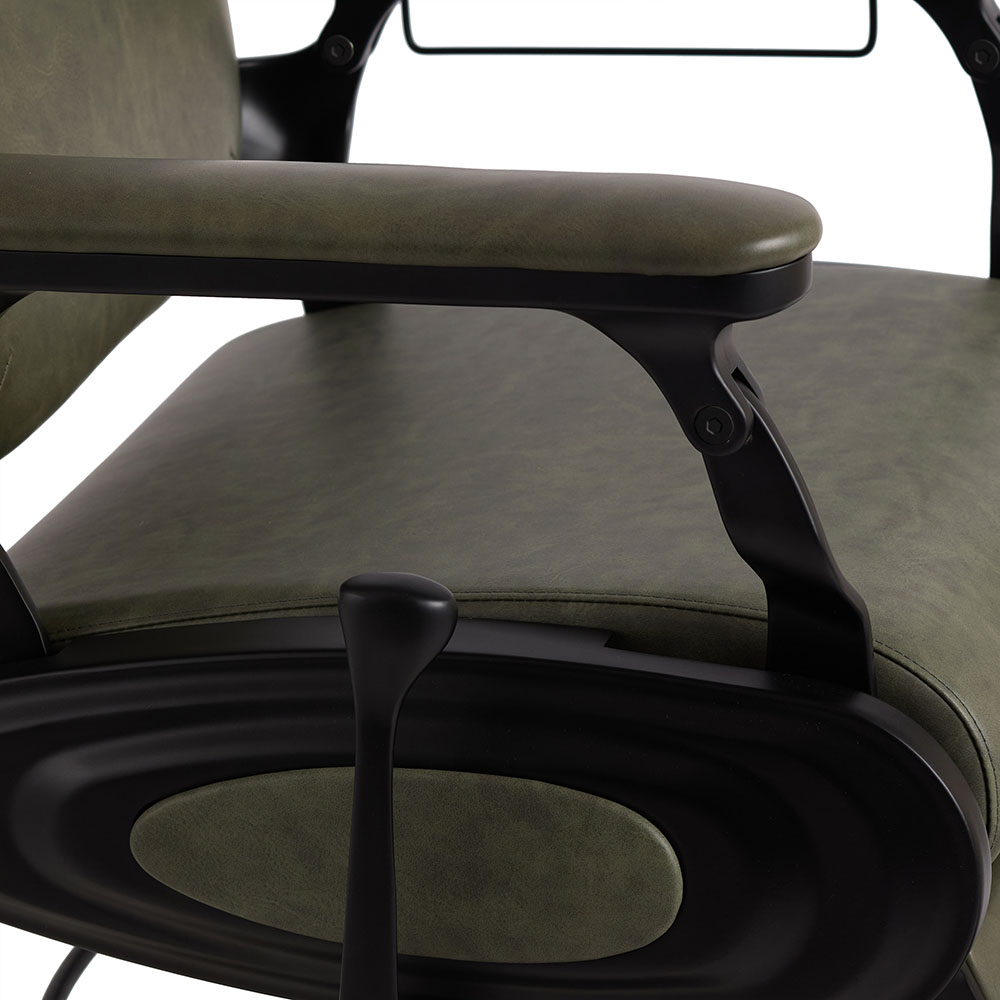 Hulk is strength with style. In sage green upholstery with a matte black base, the Hulk Barber Chair delivers power, durability, and bold design for barbers who want impact and reliability in every service.